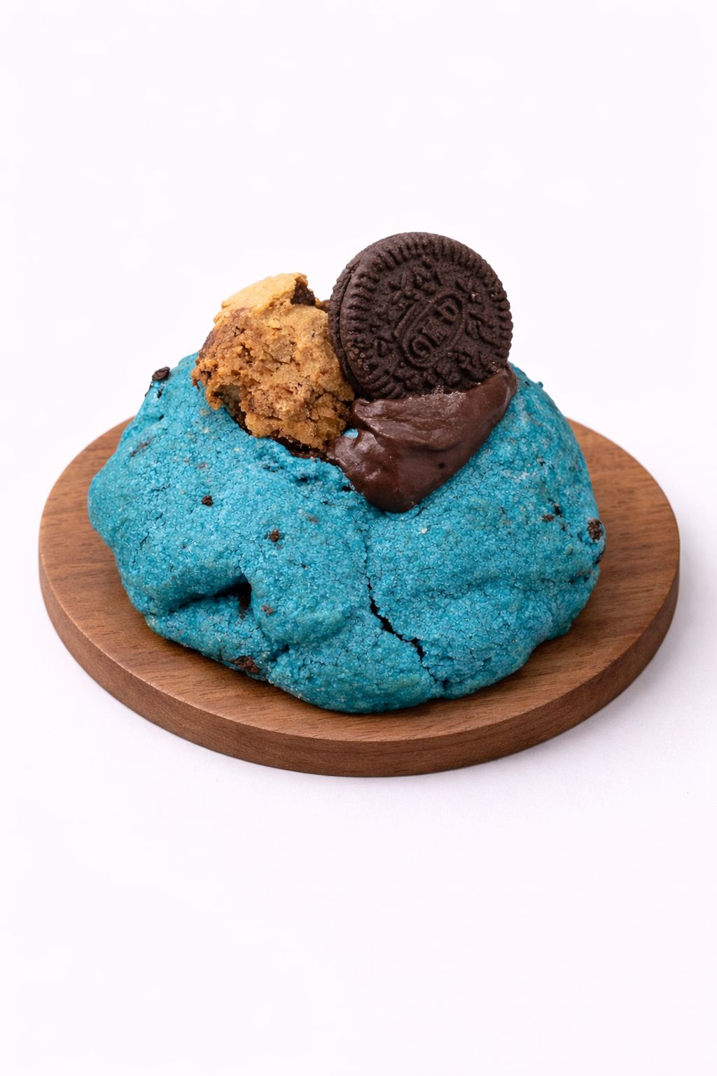 Una base de cookie azul, suave por dentro y ligeramente crujiente por fuera, cargada de trocitos de Oreo y Chips Ahoy que aportan contraste, textura y un sabor inconfundible.